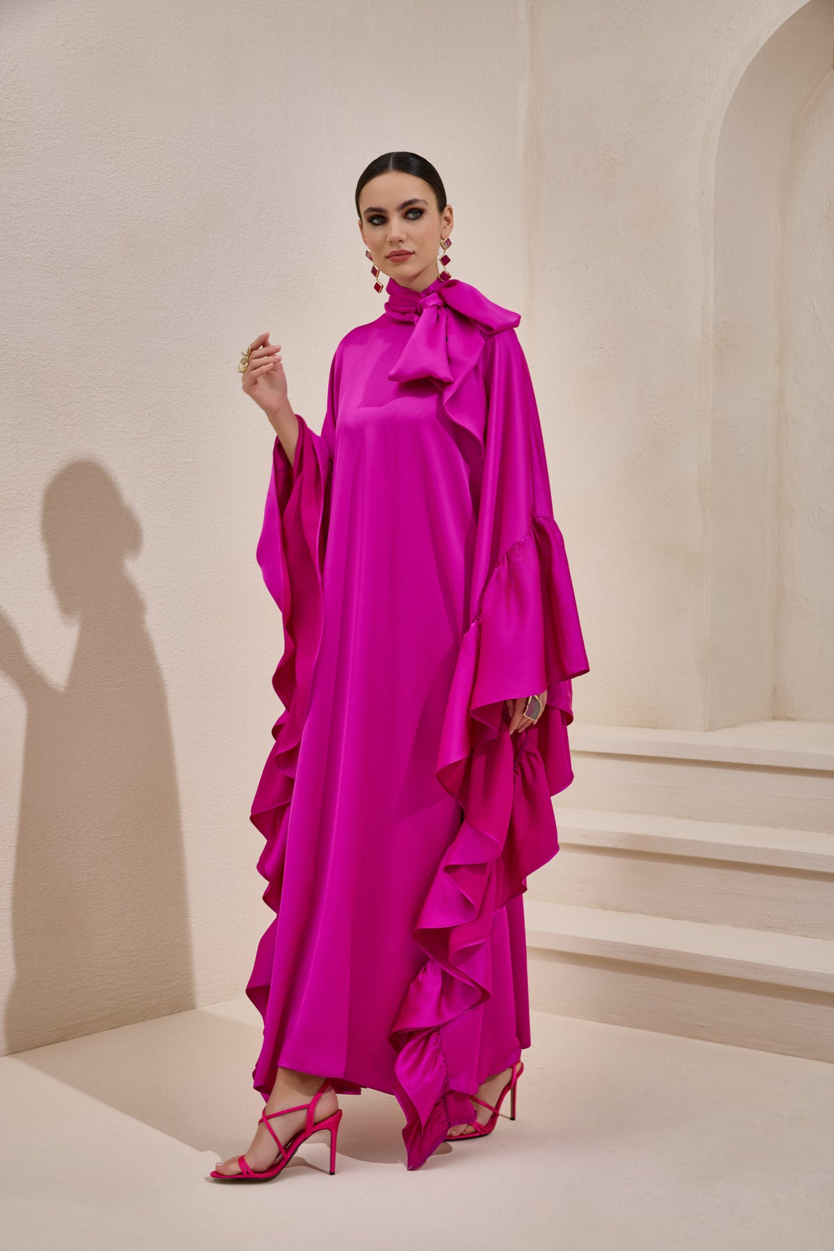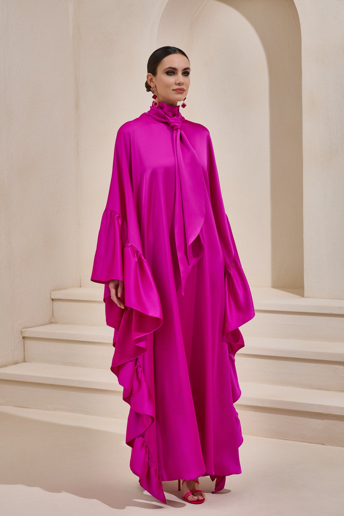 Bold and refined, Andalusian Rose embodies the spirit of timeless elegance with a modern edge. Crafted in luminous satin, its vibrant fuchsia hue commands attention, while cascading ruffle details create graceful movement with each step. A statement piece that celebrated strength and femininity, it's designed for the woman who embraces her presence and confidence.